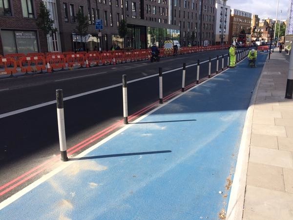 Vauxhall Bridge (2 way track) via @AsEasyAsRiding and segregation wands on the Whitechapel Rd (apologies to whoever I saved this photo from, I can't remember who it was!)