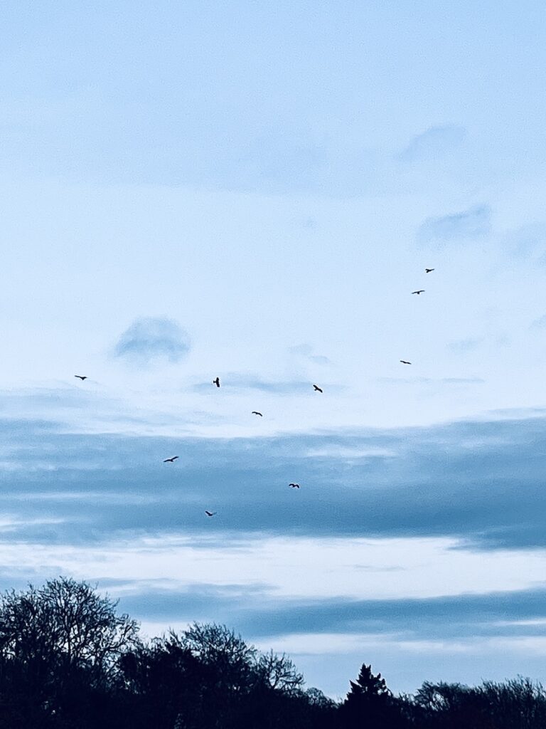 Last week I watched 43 Red Kites gather and settle in for their communal roost. My sister and I were walking down a lane near where we grew up in South Norfolk, and the Kites were calling and wheeling. Watching so many raptors together was emotional, their distinct fork-tailed shapes soaring on a backdrop of clouded greys. The scale was so strange, a flock of eagles who appeared like rooks from a distance, their movements and calls like a renaissance polyphony of multiple choirs and soloists filling the cathedral sky from every corner.