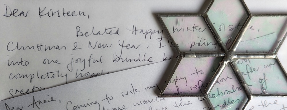 Coming to write my reply to your letter was, as always, a welcome moment of reflection after our own hectic festivities. I do love the celebration of light and life in these dark days, candles and fairy lights in amongst the evergreens. I also love the calm of January when I can sink into that dark quiet for a while.