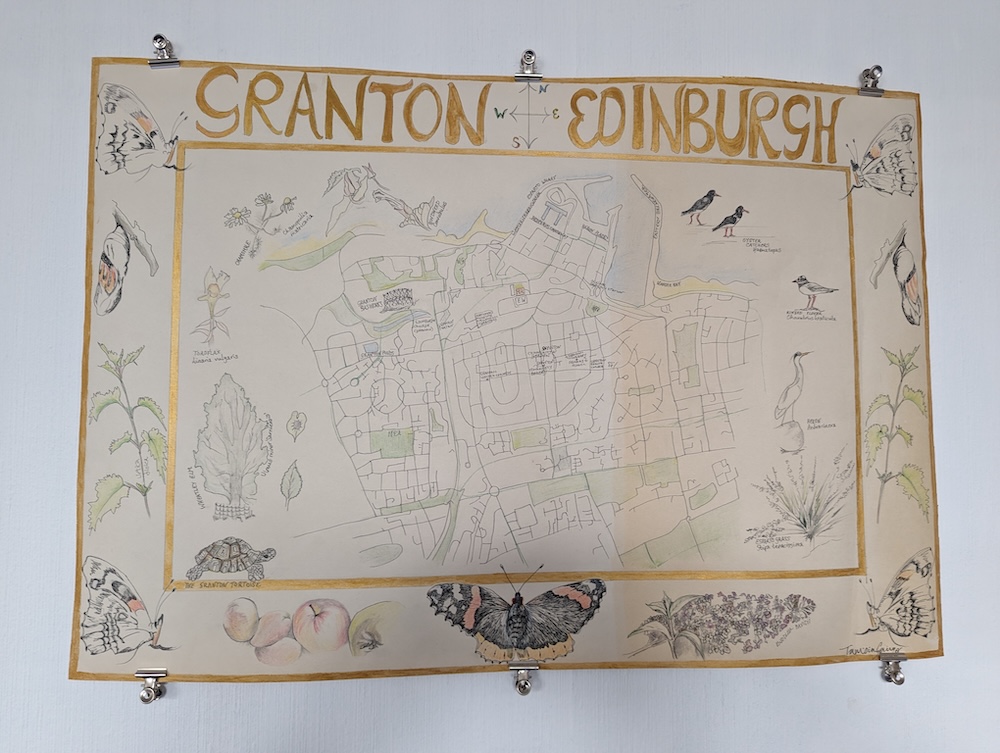 Like most cartographers, I used a bird's eye street-view, and influenced by the ancient maps I had lying around my studio, I surrounded it with illustrations of other-than-humans I had met on my walks. The red admiral butterfly is shown in various stages of its development with the nettles and buddleia it thrives on. Our resident heron is there, together with a pair of oystercatchers from the Bay, and also the Wheatley Elm from my garden. This particular elm tree is ideal for Granton for it can cope with salt and high winds.
