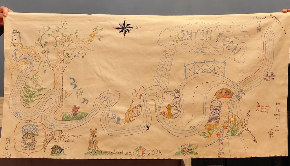 The Granton Burn, stitched map by Tamsin Grainger. Textile and cotton thread. December 2025
