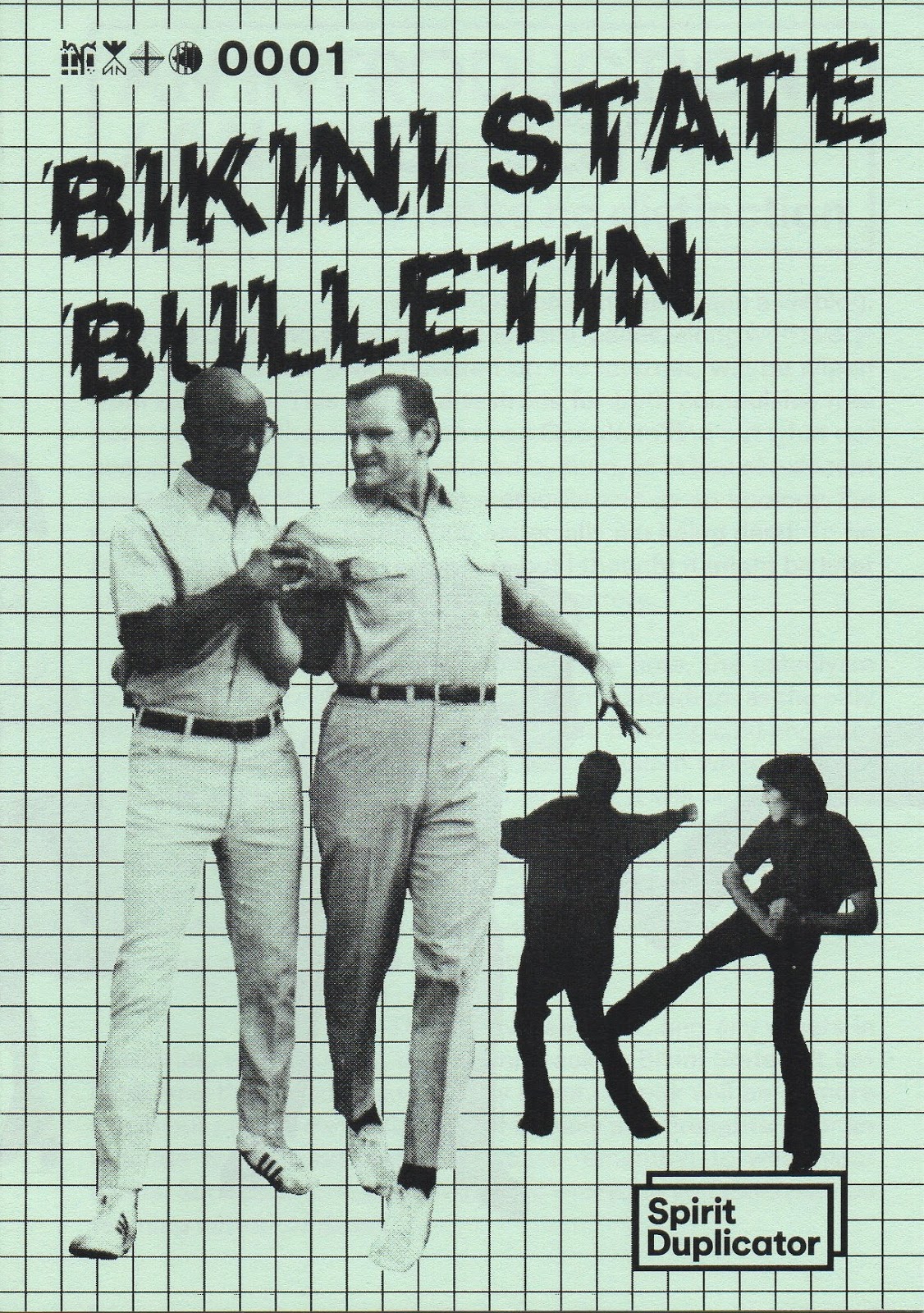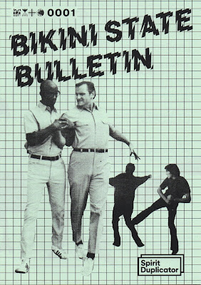 It's been quiet around here lately. Why? Because BIKINI STATE BULLETIN has been going backwards, regressing from a 21st century medium to good old fashioned paper. Bikini State Bulletin One is now available via SPIRIT DUPLICATOR. Apart from 500 tins of beans and a shar stick, it's all you need for The Crisis.