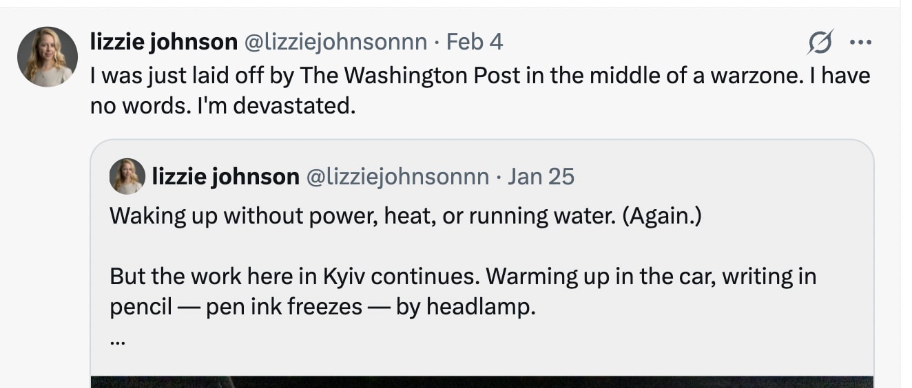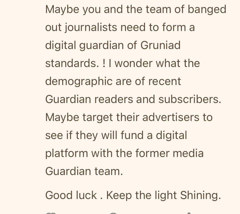 The point is that the shock and awe is meant to make us feel helpless. So I'm telling a bit of my own personal story here. Because part of what temporarily paralyzed me last week was that this is all happening while my own small corner of the mainstream media is collapsing in on itself too. The event that I've spent the last eight years warning about has come to pass and in a month, 100+ of my colleagues at the Guardian will be out of the door and my employment will be terminated. I will no longer have the platform of the news organisation where I've done my entire body of work to date and was able to communicate to a global audience.