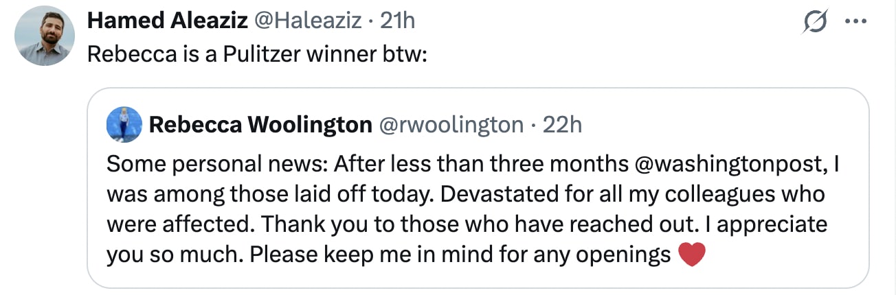 If you're scrolling English language social media today, you'll see posts from American Prospect, Zeteo, the Columbia Review of Journalism, Byline Times, Al Jazeera, Ireland's The Journal, UK Press Gazette, Rappler in the Philippines, and New Zealand's Stuff magazine as well as the 200+ foreign-language press and the outlets named above. You'll perhaps see posts from brilliant outspoken journalists like Alex Crawford from Sky News. And there is even, finally, an op-ed from the New York Times.