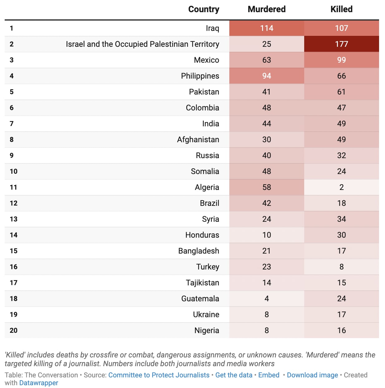 Journalists killed since 1992 according to Committee to Protect Journalists. Credit: The ConversationA chilling investigation by Yuval Abraham of +972 magazine revealed the existence of a 'legitimisation cell' inside the IDF tasked, among other things, with 'identifying Gaza-based journalists it could portray as undercover Hamas operatives, in an effort to blunt growing global outrage over Israel's killing of reporters'. A previous investigation by the same outlet documented how AI was being used to profile and surveille targets for assassination creating automated 'kill lists'.