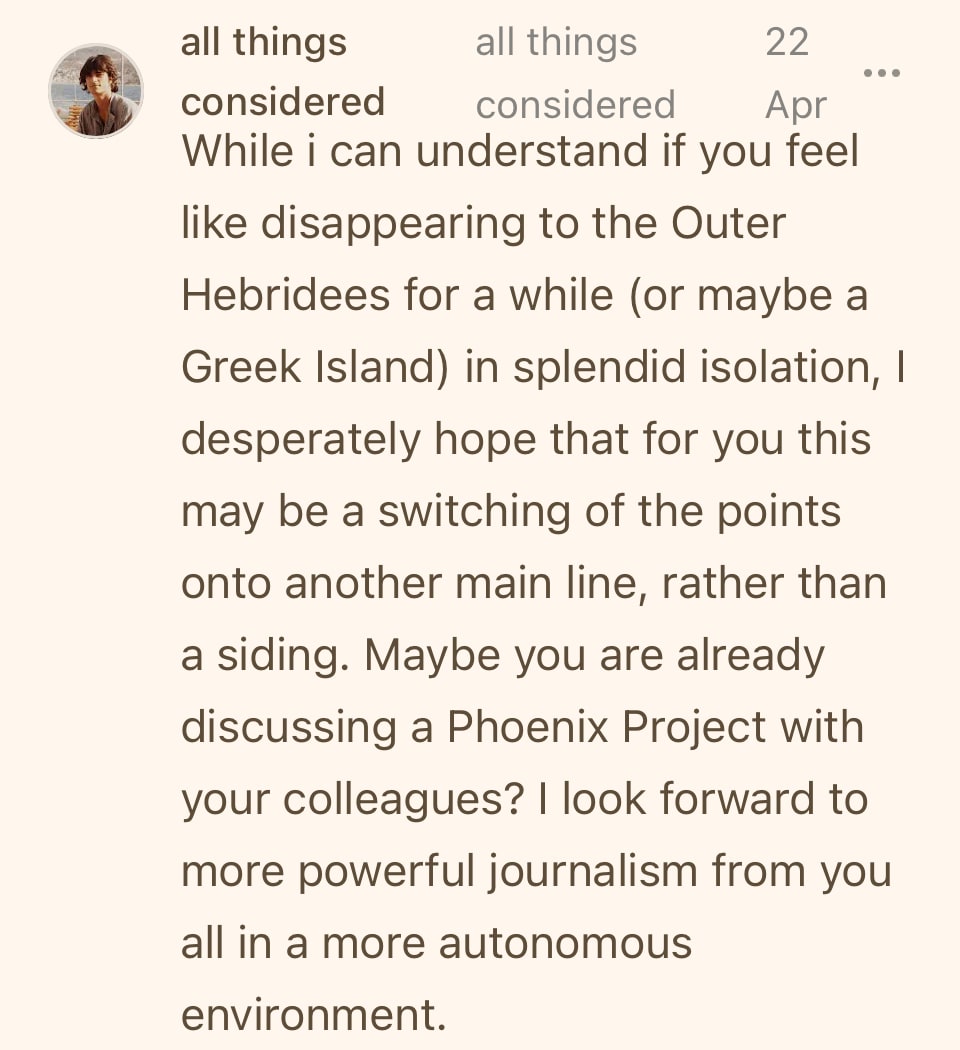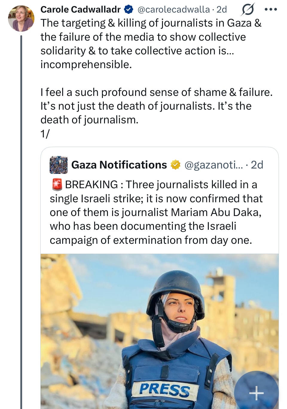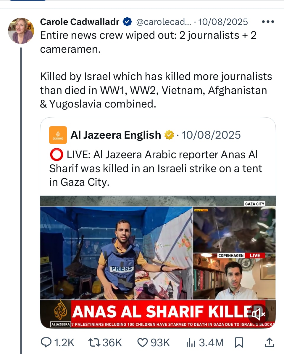 I'm going to post a piece tomorrow that goes into this in much more detail. It's been sitting in my drafts folder for nearly two months. That's where the imposter syndrome comes in. I have many criticisms of large, resourced mainstream media organisations but I'm also in awe of the brilliant and brave reporters who are doing the awful but necessary job of detailing what's happening and I've never wanted to be that person, endlessly castigating "the MSM". I've proudly been part of the MSM. I've always fought its corner. But this issue around press freedom has what's crystallised the issue so clearly. It's a sign of what's to come. Gaza has been the experimental laboratory for so many things, weapons, surveillance, profiling and targeting and now silencing journalists in the bluntest way possible. If we can't stand against this, we are truly lost. The lack of leadership from the prestige legacy outlets is truly shocking.