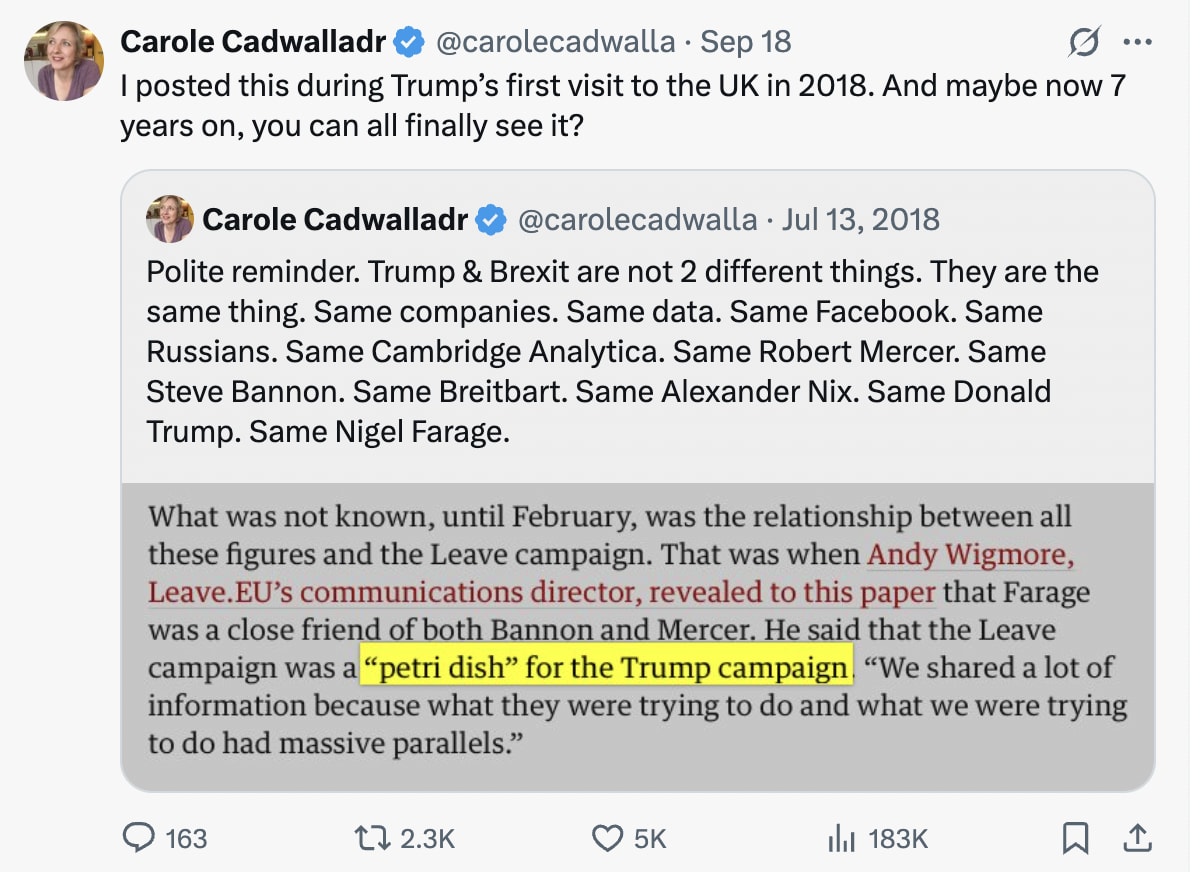 A note on who I am: I'm an investigative journalist who's spent a decade reporting on the collision of technology and democracy including exposing the Facebook/Cambridge Analytica scandal for the Guardian and the New York Times. Two years ago, I called the alliance of Trump, Silicon Valley and a global axis of autocracy: a tech bro oligarchy, aka the Broligarchy. Please help me continue to expose it.