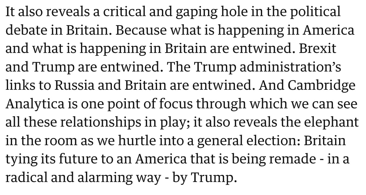 Itt's what it's possible to do with that data, that the real nightmare begins. What machine learning algorithms and highly personalised targeting can do. It's a digital coup. An information coup. And we have to understand what that means. Our fleshy bodies still inhabit earthly spaces but we are all, also, digital beings too. We live in a hybrid reality. And for more than a decade we have been targets of hybrid warfare, waged by hostile nation states whose methodology has been aped and used against us by political parties in a series of disrupted elections marked by illegal behaviour and a lack of any enforcement. But this now takes it to the next level.