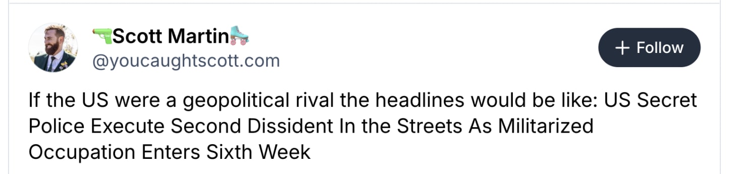 Musk's troops - because that's what they are, mercenaries - are acting in criminal, unlawful, unconstitutional ways. Organisations are acting quickly, taking lawsuits, and for now the courts are holding. But the key essential question is whether their rulings can be enforced with a political weaponized Department of Justice and FBI. What Mark Bergman told me (and is in the extended note below) is that they've known since the summer that there would be almost no way of pushing back against Trump. This politicisation of all branches of law enforcement creates a vacuum at the heart of the state. As he says in that note, the ramifications of this are little understood outside the people inside Washington who study this for a living.